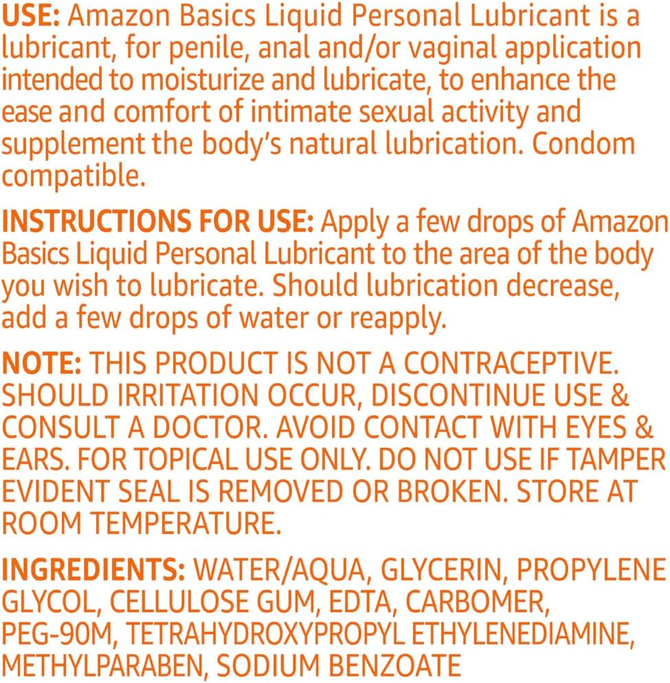 Amazon Basics Liquid Personal Lubricant is a water based lubricant that moisturizes, lubricates and enhances the ease and comfort of intimate sexual activity. This easy to clean and non staining formula delivers a natural feel and is suitable for all skin types. Amazon Basics Liquid is compatible with silicone and rubber toys. It is safe to use with natural rubber latex, polyurethane, and polyisoprene condoms. This formula is made in the USA and is FDA cleared.