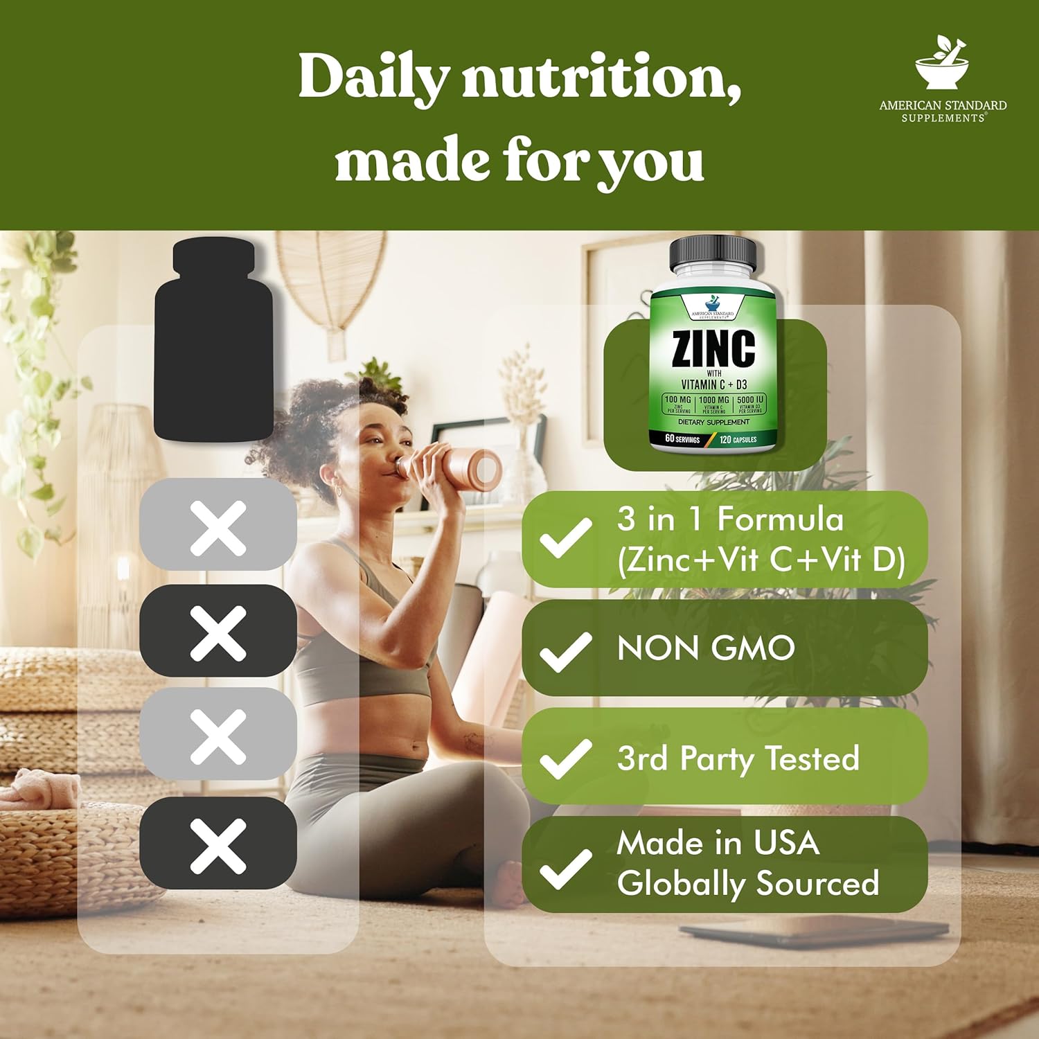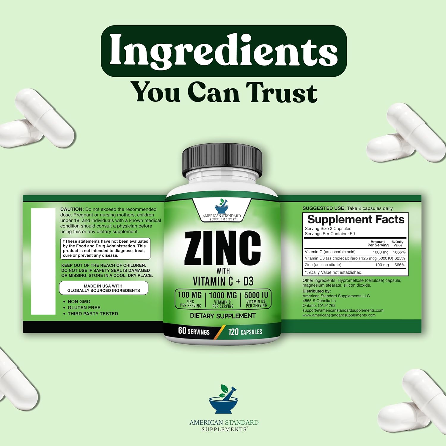 American Standard Supplements Zinc 100mg, Vitamin C 1000mg, and Vitamin D3 5000 IU (125mcg) Per Serving – Gluten Free, Non-GMO, 120 Capsules, 60 Servings