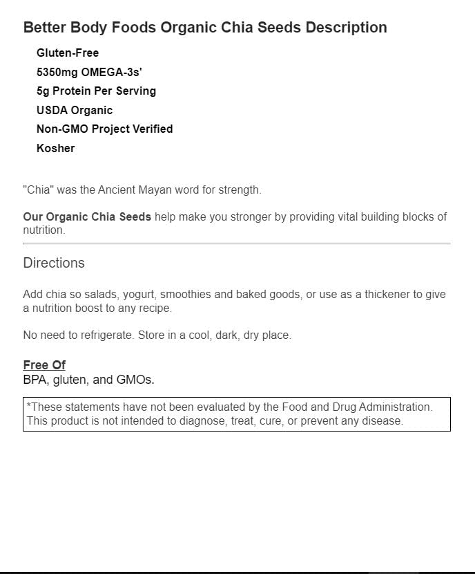3 reviews for Better Body Foods, Organic Chia Seeds with Calcium, Iron, Potassium, 5350mg Omega-3s, Non-GMO and Gluten Free | Add Omega 3 Protein to Salad, Smoothie, Oatmeal Acai Bowl | Pack of 2 – 567 grams Airtight Jars