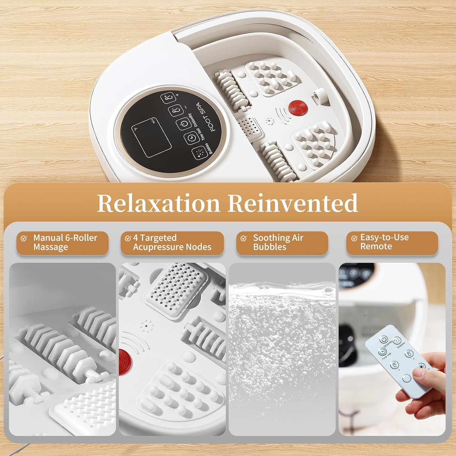 Intelligent temperature control and timer: The foot bath bucket has intelligent temperature control function and can be adjusted between 118°F-135°F. The built-in timer can set the constant temperature for 10 to 60 minutes. The water temperature can be maintained without additional hot water, making your Foot spa comfortable and easy