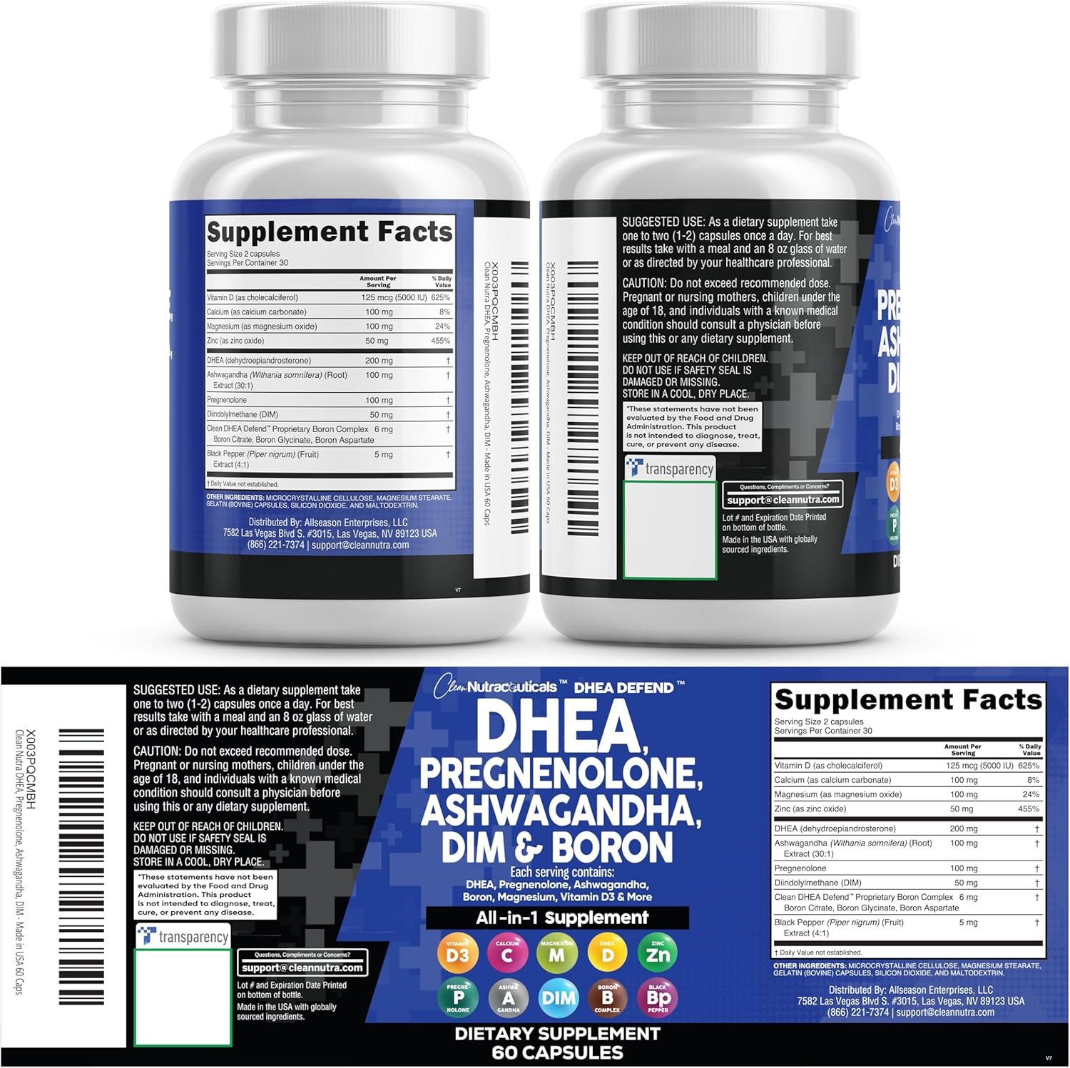 DHEA 200mg Supplement Pregnenolone 100mg for Men & Women with DIM Ashwagandha Boron 6mg Complex Calcium Magnesium Zinc 50mg Vitamin D3 5000 iu Hormone Support Capsules Pills – Made in USA 60 Ct