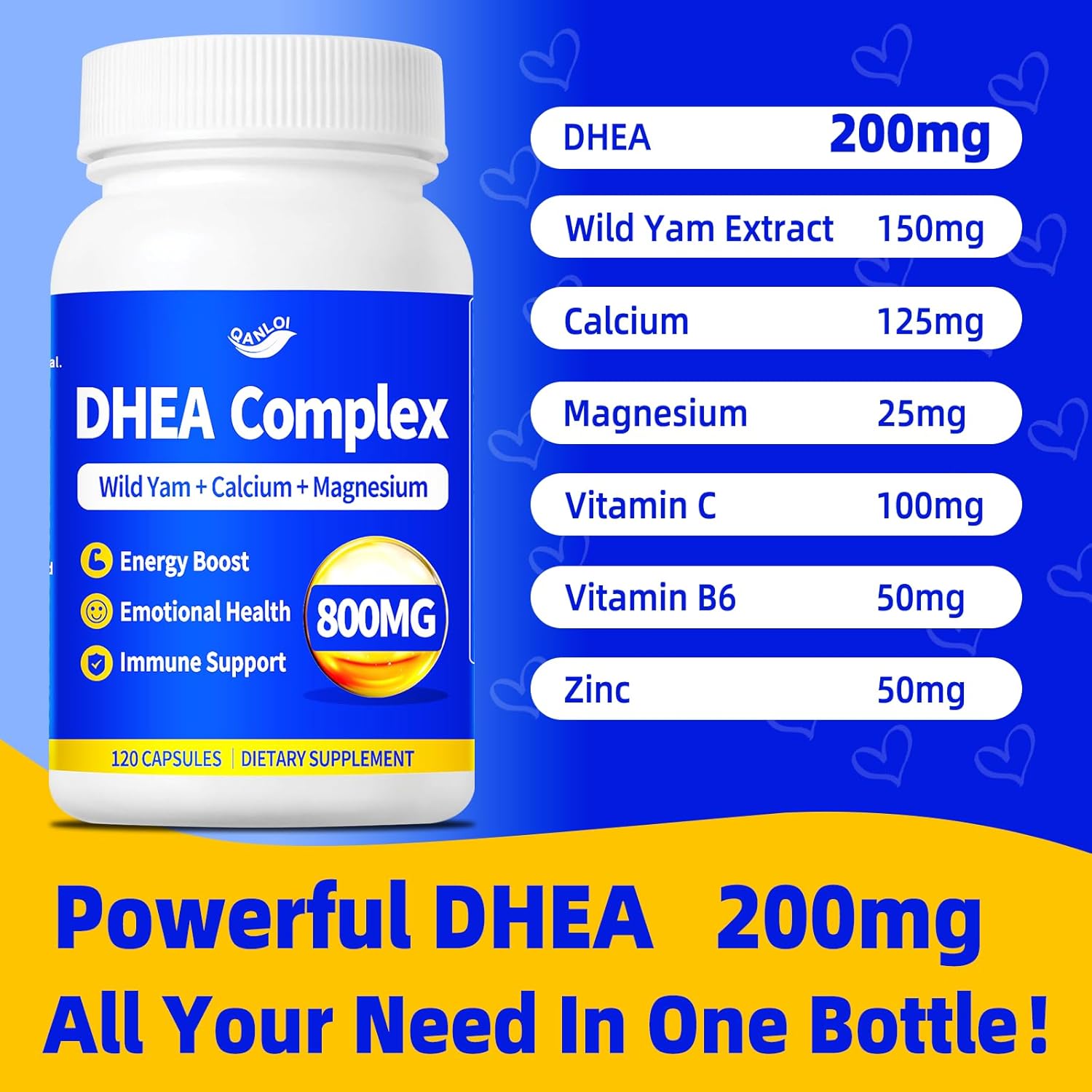 DHEA Supplement For Women & Men 200mg, Micronized DHEA Complex 800mg With Wild Yam, Calcium, Magnesium, Vitamin C, Supports for Immunity, Energy, Metabolism Emotion, Non-GMO, Gluten Free, 120 Capsules