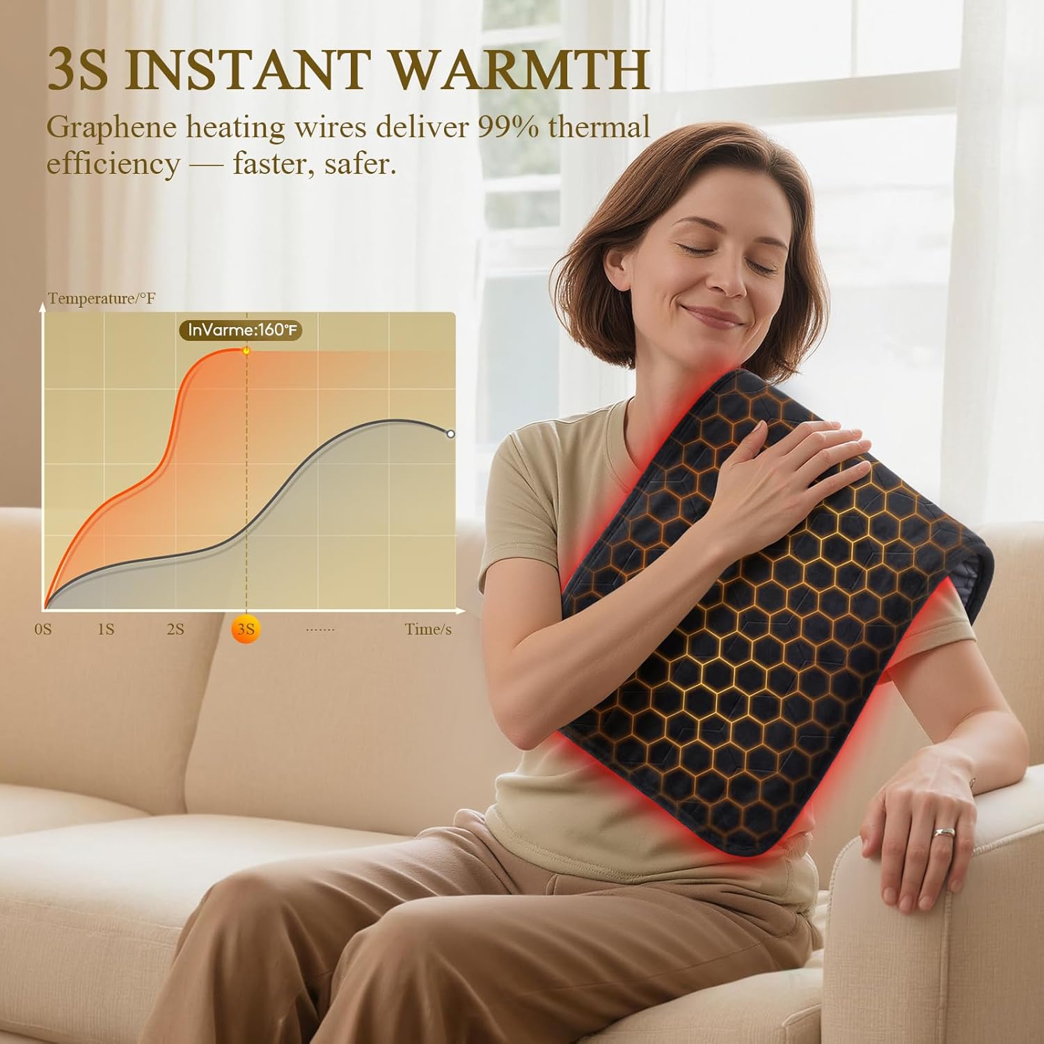 3S INSTANT HEAT WITH DUAL GRAPHENE TECH: InVarme electric heating pad integrates graphene into both the heating wire and the fabric, delivering heating speed 10X faster than conventional heating pads. Heats up in just 3 seconds, locking warmth in longer and deeper.