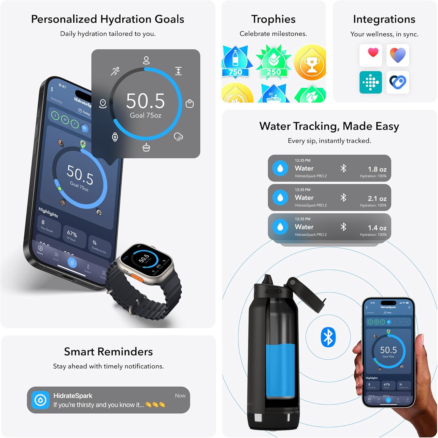 BLUETOOTH SYNC + FREE APP INTEGRATION – Connect via Bluetooth to the free HidrateSpark app. Track your progress, receive personalized hydration goals, view history, join challenges, compete with friends, earn trophies, manage multiple bottles from one app, and hit your hydration goals.