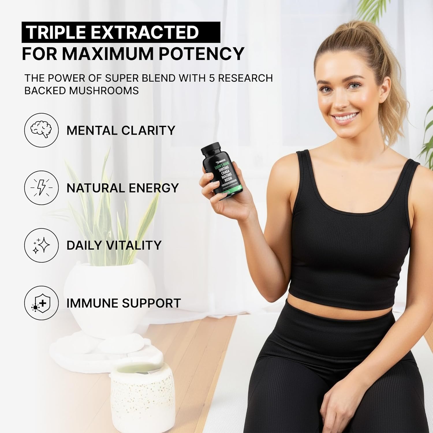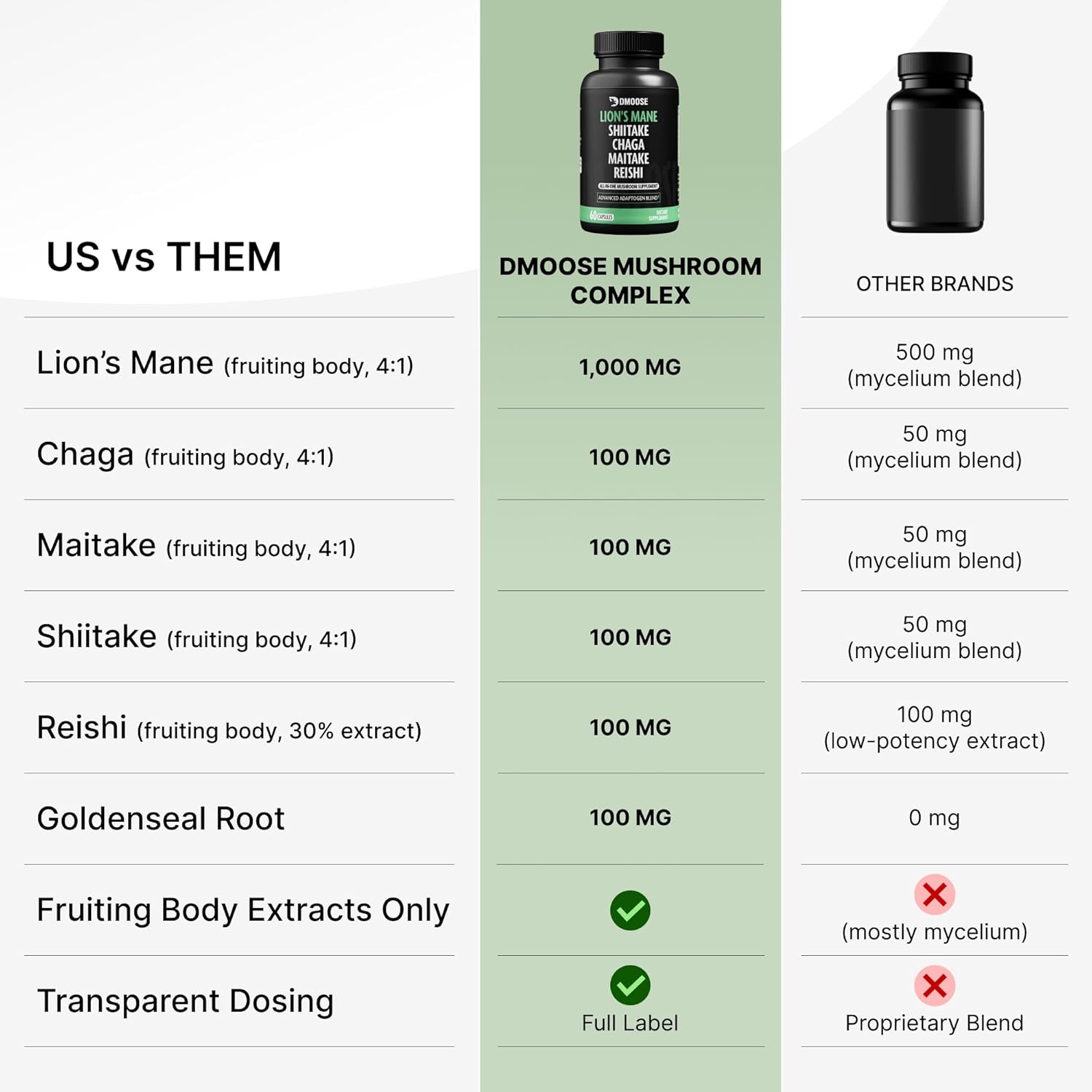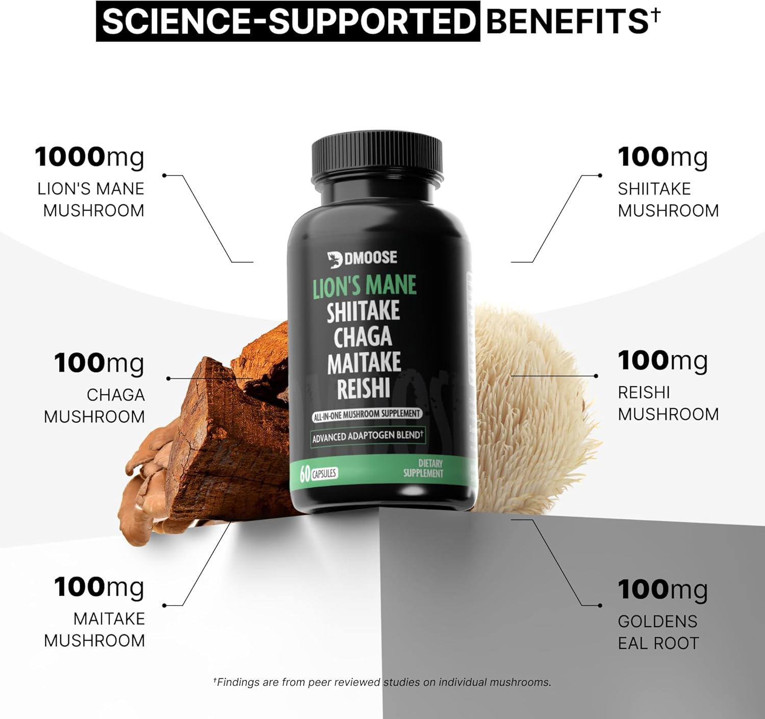 5 MUSHROOMS IN 1 POWERFUL CAPSULE: Simplify your health routine with DMoose Mushroom Supplements, a potent 5-in-1 formula combining Lions Mane, Chaga, Maitake, Shiitake, & Reishi Mushrooms. Each capsule provides boosting benefits to support your brain health, memory, focus, energy, and immune support.