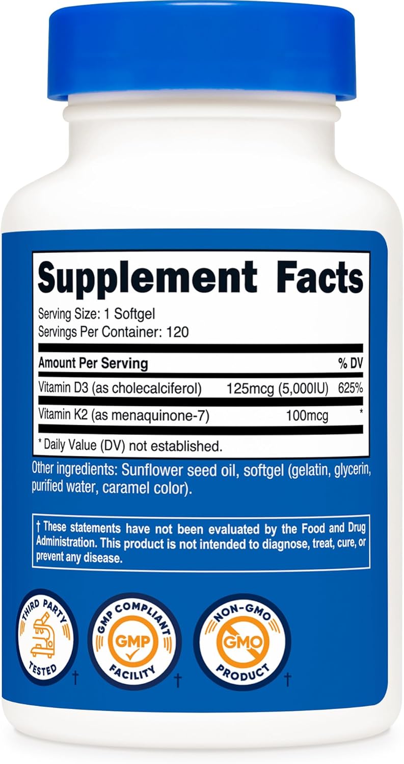 This supplement is exactly what I needed—a clean, simple formula combining Vitamin D3 (5000 IU) with K2 MK-7 (100mcg) for better absorption and support. I’ve done the research, and pairing D3 with K2 is crucial for directing calcium to the bones instead of the arteries, and this product makes that easy.The softgels are small, easy to swallow, and don’t leave a weird aftertaste. I love that it’s gluten-free and non-GMO, which gives me peace of mind about quality. I feel more energized and confident knowing I’m supporting both my immune system and cardiovascular health every day.Highly recommend for anyone looking to optimize their D3 routine!