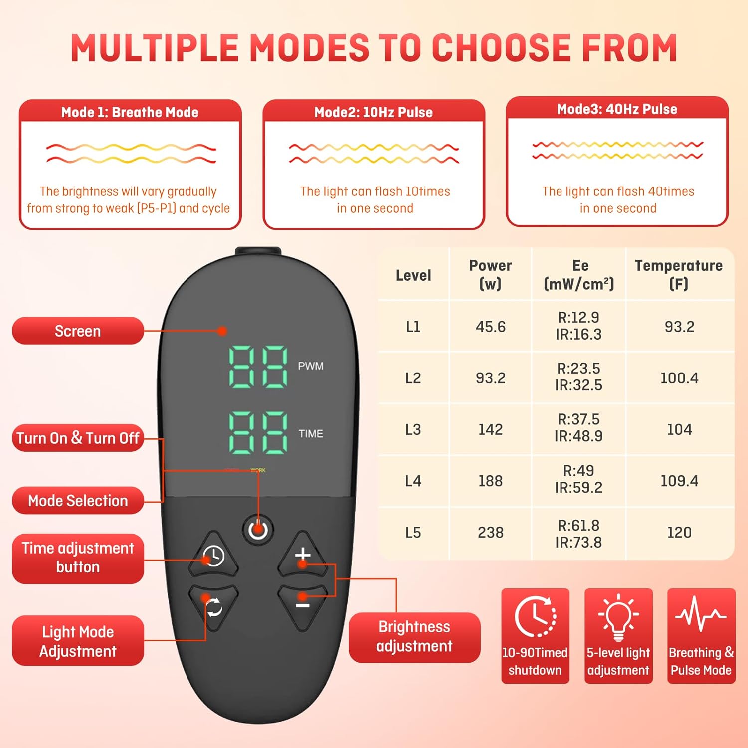 ADJUSTABLE BRIGHTNESS & TIMER – Set your red light therapy session with 5 levels of light intensity and a 10-60 minute timer. The automatic shut-off feature on full body red light therapy devices ensures safe, customizable use for pain relief and improved sleep